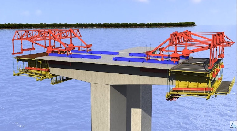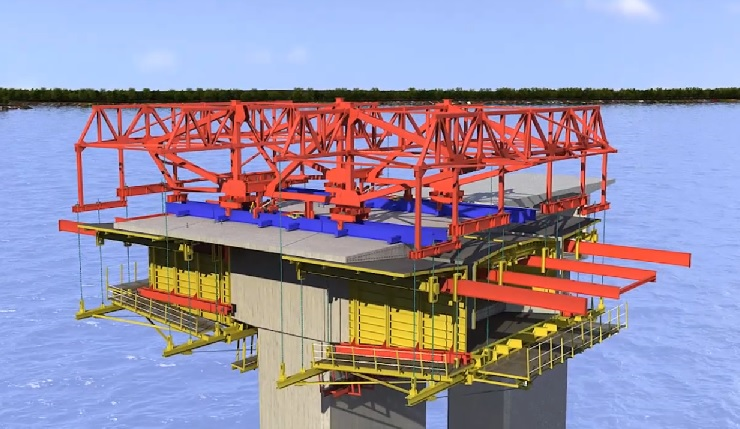 이젠 교각위에 상판을 시공할 특수한 거푸집을 설치해요